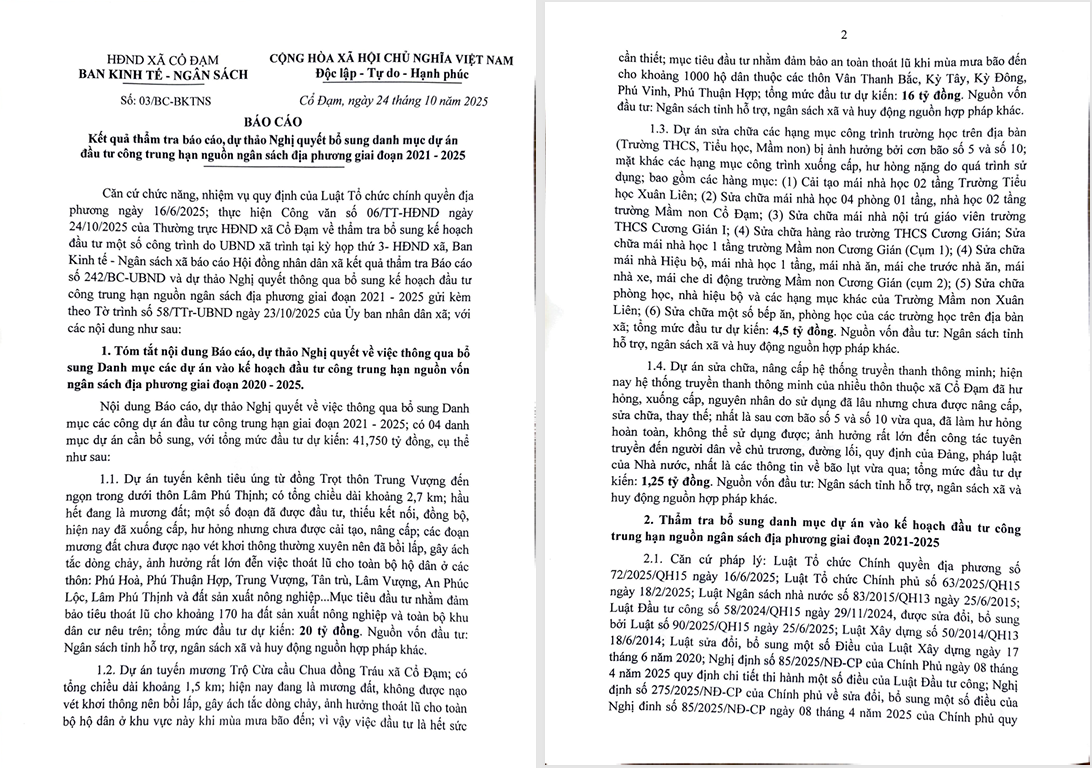 Nội dung thẩm tra tập trung vào 04 dự án cần bổ sung, bao gồm các công trình kênh tiêu, mương thoát nước, sửa chữa nâng cấp các trường học và hệ thống truyền thanh nhằm khắc phục tình trạng xuống cấp, đảm bảo an toàn, phục vụ đời sống dân sinh và công tác giáo dục - truyền thông của địa phương.