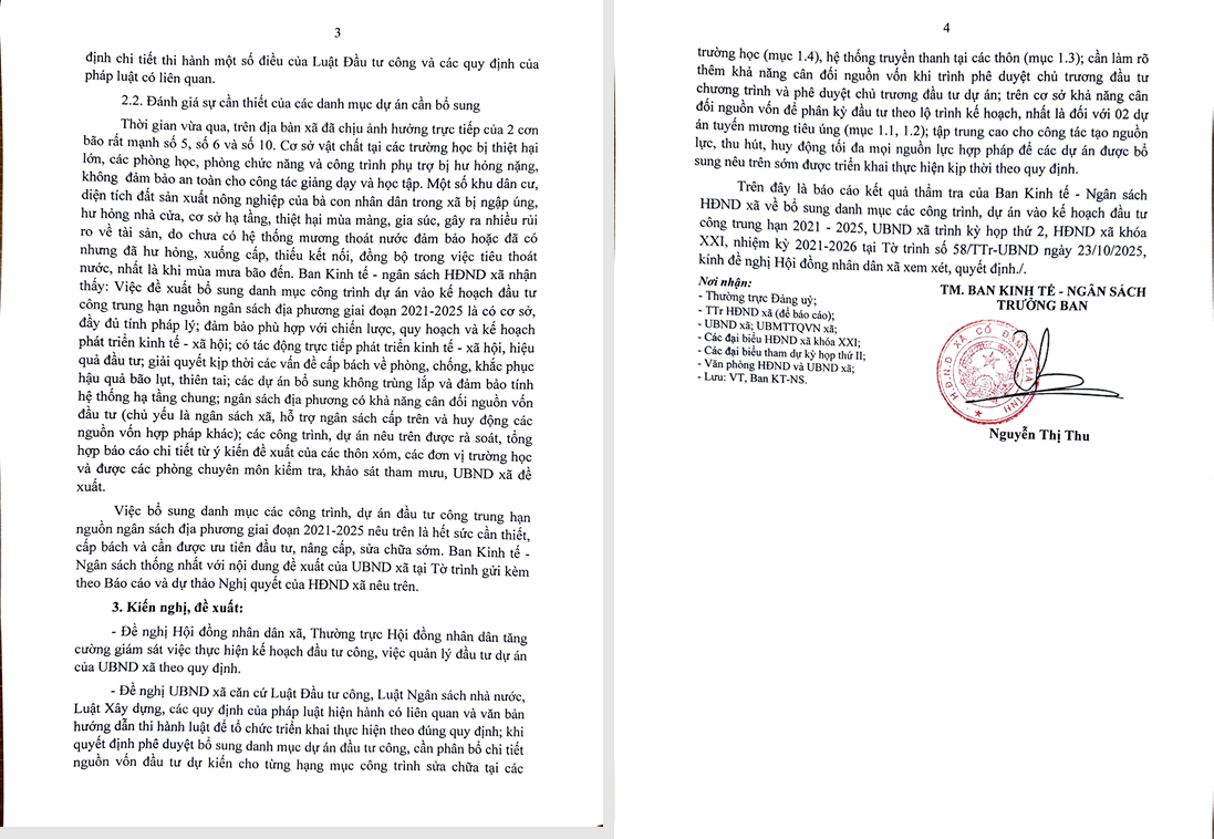 Qua xem xét, Ban Kinh tế - Ngân sách nhận thấy việc bổ sung các dự án là cần thiết, phù hợp quy hoạch phát triển kinh tế - xã hội của xã, có khả năng cân đối nguồn vốn và đề nghị Hội đồng nhân dân xã xem xét, thông qua tại kỳ họp tới.