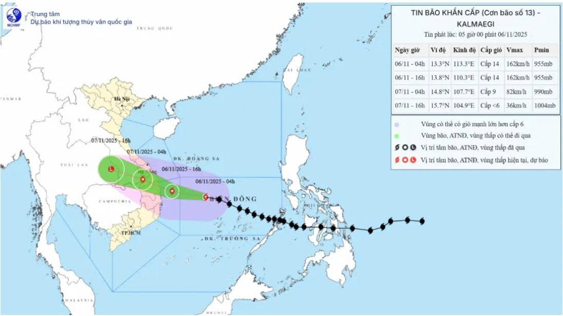 Từ sáng 6/11, vùng biển từ Nam Quảng Trị đến Khánh Hòa (bao gồm đặc khu Lý Sơn, đảo Cù Lao Chàm) gió mạnh dần lên cấp 6-7, sau tăng lên cấp 8-11, sóng biển cao 3-6m, vùng gần tâm bão đi qua mạnh cấp 12-14, giật cấp 17, sóng biển cao 7-9m; biển động dữ dội.