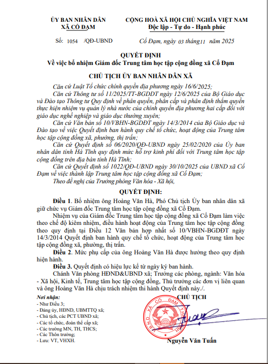 Ủy ban nhân dân xã Cổ Đạm quyết định bổ nhiệm ông Hoàng Văn Hà, Phó Chủ tịch UBND xã, giữ chức vụ Giám đốc Trung tâm học tập cộng đồng xã Cổ Đạm (kiêm nhiệm).