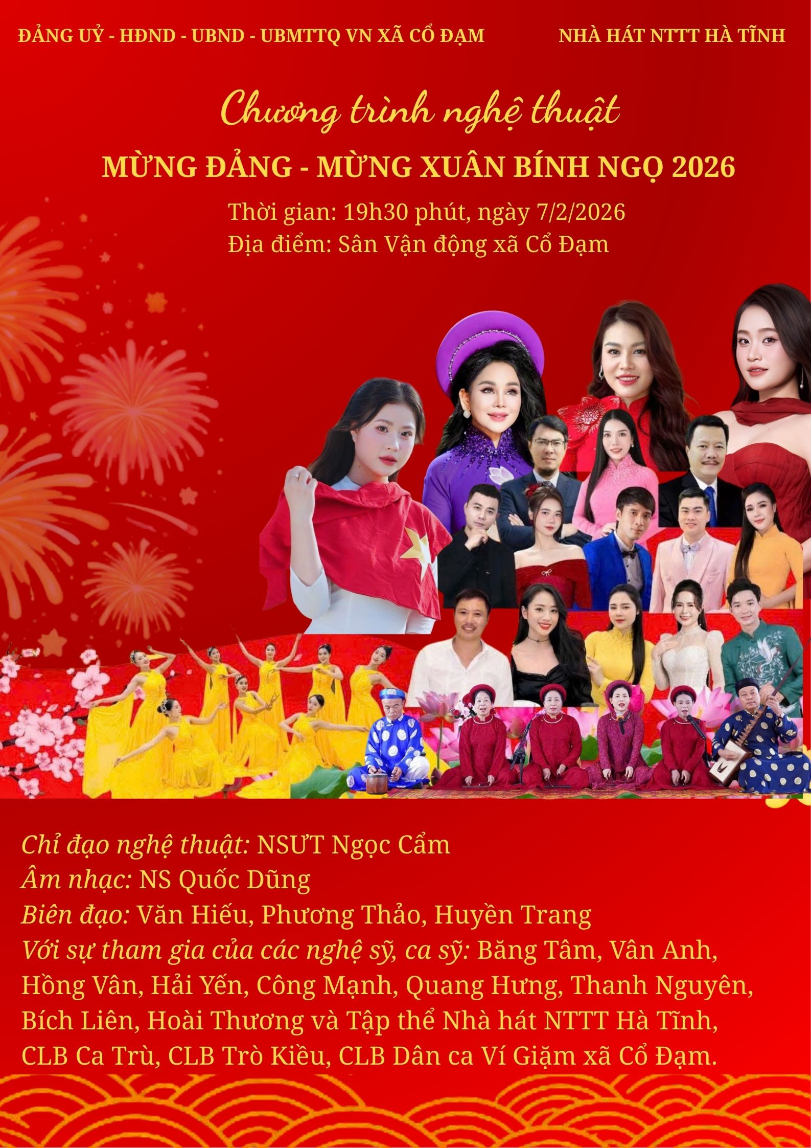 Chương trình do UBND xã Cổ Đạm phối hợp với Nhà hát Nghệ thuật truyền thống Hà Tĩnh tổ chức với sự tham gia của các ca sĩ: Công Hoàn, Công Mạnh, Quang Hưng, Hoài Thương, Thanh Nguyên, Xuân Trường, Phương Thảo và tập thể Nhà hát Nghệ thuật truyền thống Hà Tĩnh biểu diễn. Ngoài ra, chương trình có sự tham gia của nghệ sỹ Băng Tâm, ca sỹ Hồng Vân, ca sỹ Vân Anh, ca sỹ Hải Yến, CLB Ca trù Cổ Đạm và CLB Trò Kiều, các câu lạc bộ dân ca ví giặm trên địa bàn.