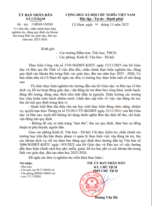UBND xã đề nghị các đơn vị nghiêm túc triển khai thực hiện nhằm đảm bảo quyền lợi cho học sinh, phụ huynh và giữ vững sự minh bạch trong công tác tài chính giáo dục trên địa bàn.