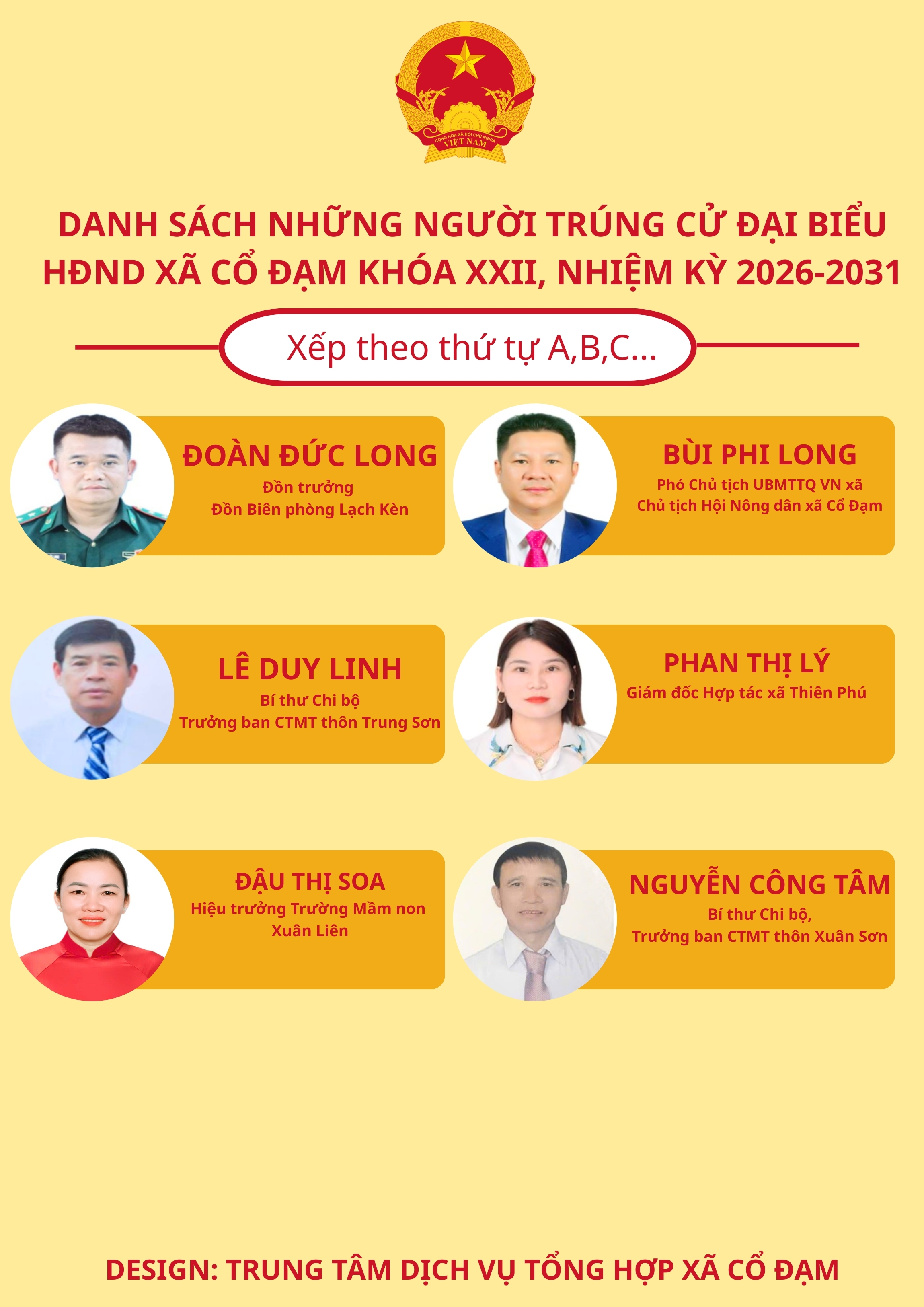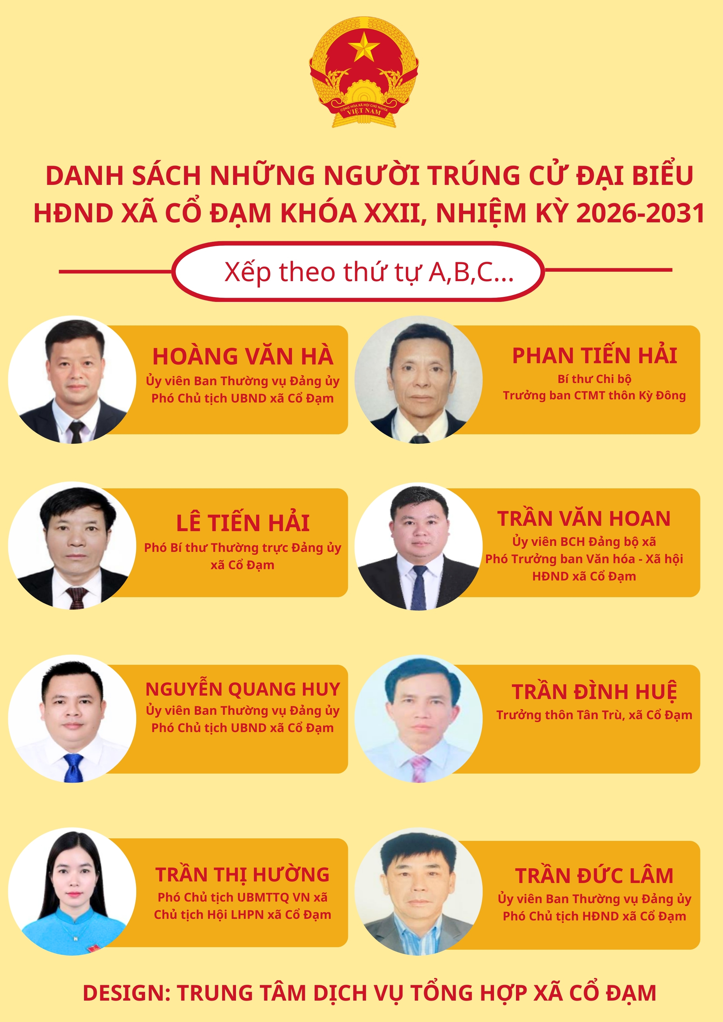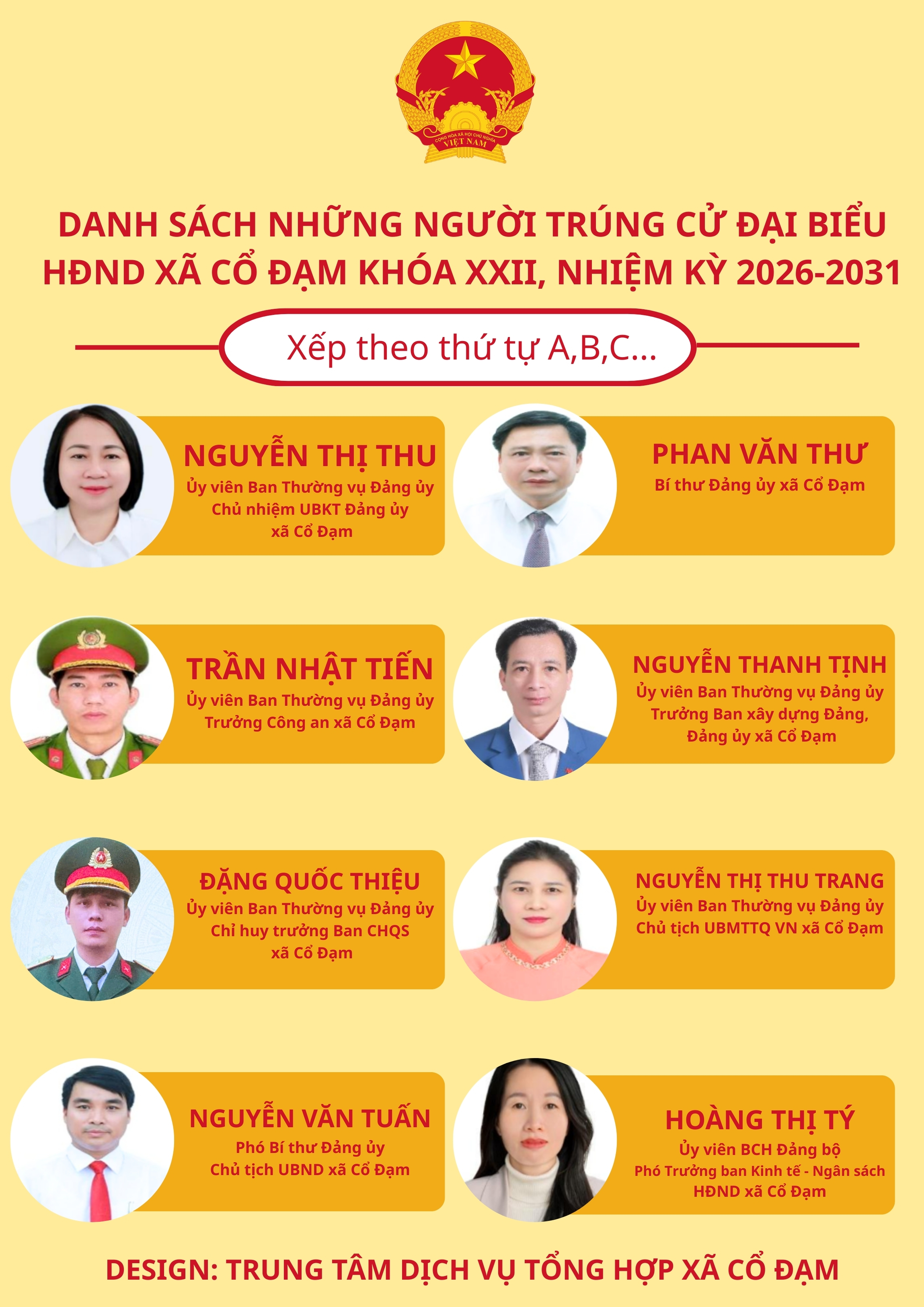 [Graphics] 22 người trúng cử đại biểu Hội đồng nhân dân xã Cổ Đạm khóa XXIIĐức Đồng19/03/2026A -A+Đức Đồng19/03/2026A -A+Ủy ban bầu cử xã Cổ Đạm công bố danh sách 22 người trúng cử đại biểu Hội đồng nhân dân xã Cổ Đạm khóa XXII, nhiệm kỳ 2026-2031. Đức Đồng