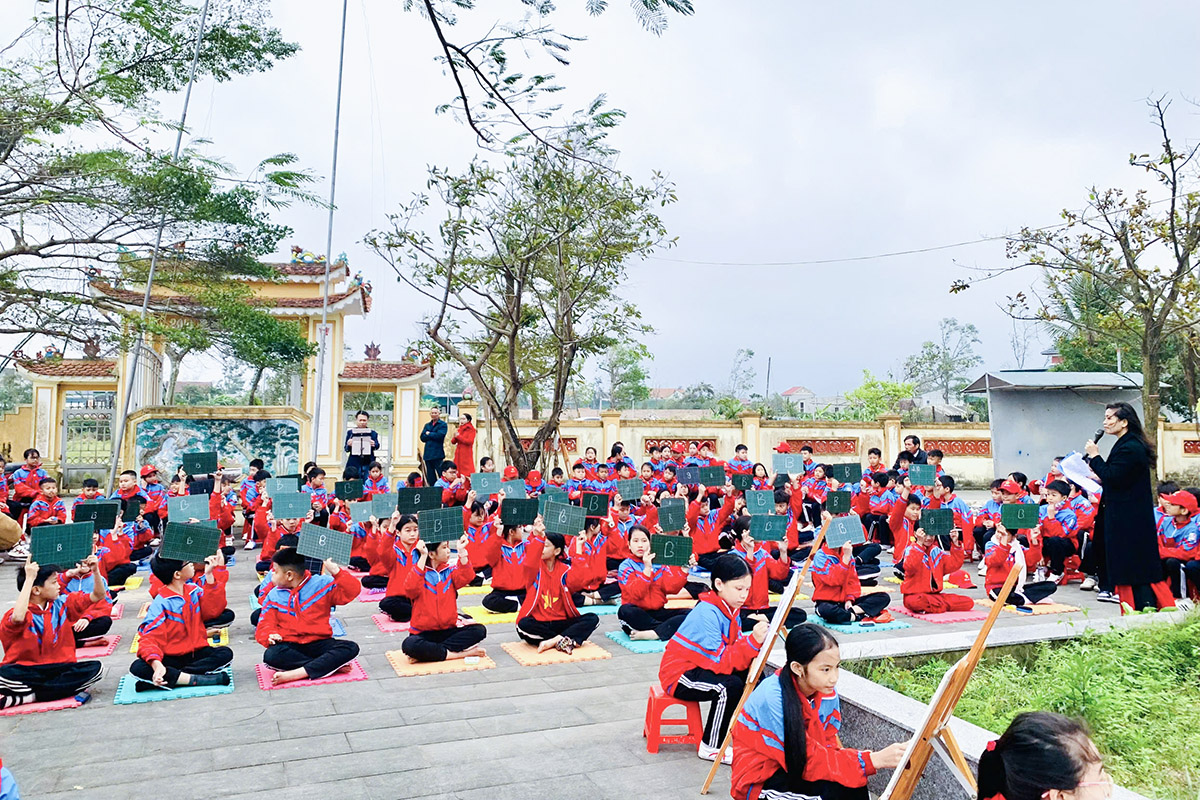 Mở đầu buổi lễ, không gian trầm mặc của ngôi đình cổ bừng sáng bởi các tiết mục văn nghệ sôi động do các bạn học sinh khối 4 và khối 5 biểu diễn. Những bài ca, điệu múa ca ngợi Đảng, Bác Hồ và nét đẹp quê hương Hà Tĩnh như những đóa hoa xuân sớm, gửi gắm lòng biết ơn của thế hệ trẻ đối với cha ông.