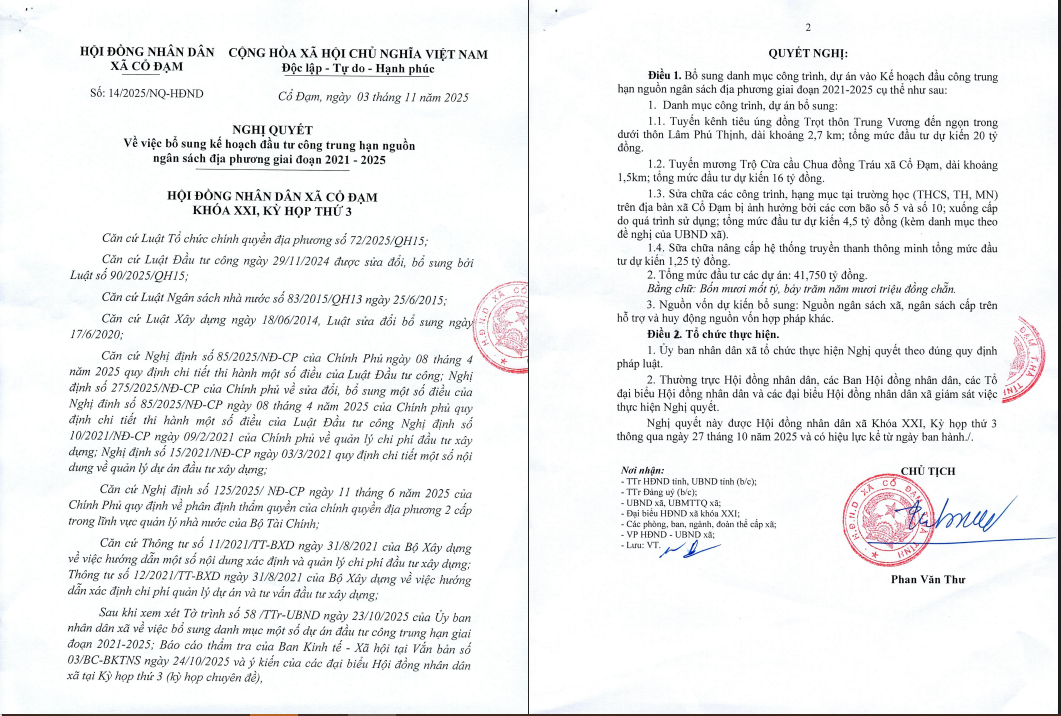 Theo Nghị quyết, xã Cổ Đạm bổ sung 4 công trình, dự án trọng điểm gồm: Tuyến kênh tiêu úng từ đồng Trọt thôn Trung Vương đến thôn Lâm Phú Thịnh (dài 2,7 km); tuyến mương Trộ Cửa cầu Chua đồng Tráu (dài 1,5 km); sửa chữa các hạng mục trường học bị ảnh hưởng bởi thiên tai và xuống cấp; sửa chữa, nâng cấp hệ thống truyền thanh thông minh. Tổng mức đầu tư dự kiến cho các dự án là 41,750 tỷ đồng, từ ngân sách xã, ngân sách cấp trên hỗ trợ và các nguồn vốn hợp pháp khác.