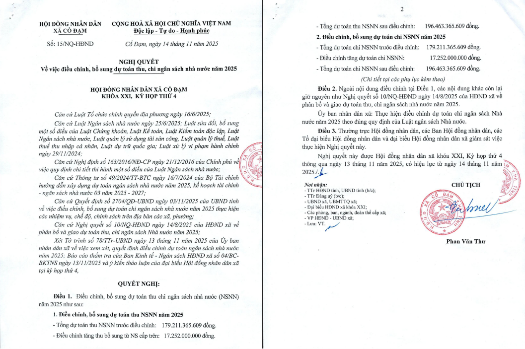 Theo Nghị quyết, tổng dự toán thu và chi ngân sách nhà nước năm 2025 của xã được điều chỉnh tăng thêm 17.252.000.000 đồng so với dự toán đã giao trước đó. Sau điều chỉnh, tổng dự toán thu và chi ngân sách nhà nước năm 2025 của xã là 196.463.365.609 đồng. Các nội dung không thuộc phạm vi điều chỉnh tiếp tục thực hiện theo Nghị quyết số 10/NQ-HĐND ngày 14/8/2025 của HĐND xã.