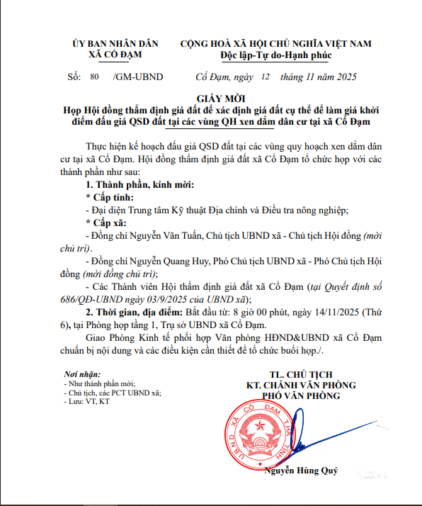 Cấp xã: Đồng chí Nguyễn Văn Tuấn, Chủ tịch Ủy ban nhân dân xã – Chủ tịch Hội đồng (chủ trì cuộc họp); đồng chí Nguyễn Quang Huy, Phó Chủ tịch Ủy ban nhân dân xã – Phó Chủ tịch Hội đồng (đồng chủ trì); cùng các thành viên Hội đồng thẩm định giá đất xã Cổ Đạm theo Quyết định số 686/QĐ-UBND ngày 03/9/2025 của Ủy ban nhân dân xã.