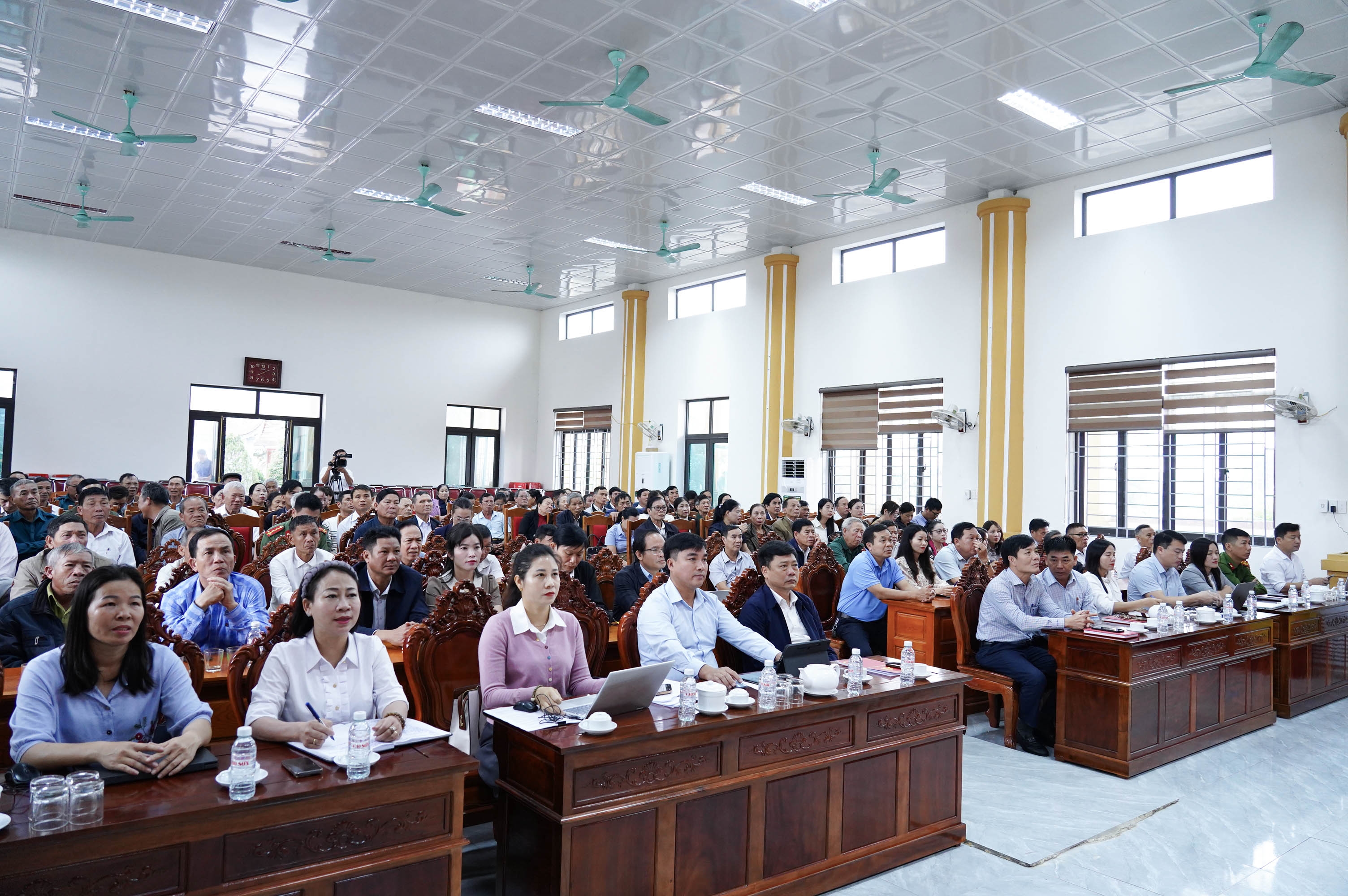 Bí thư Đảng ủy xã Cổ Đạm Phan Văn Thư, Phó Bí thư Thường trực Đảng ủy Lê Tiến Hải, Chủ tịch UBND xã Nguyễn Văn Tuấn, các ủy viên BTV Đảng ủy, đông đảo cử tri cùng dự điểm cầu xã Cổ Đạm.