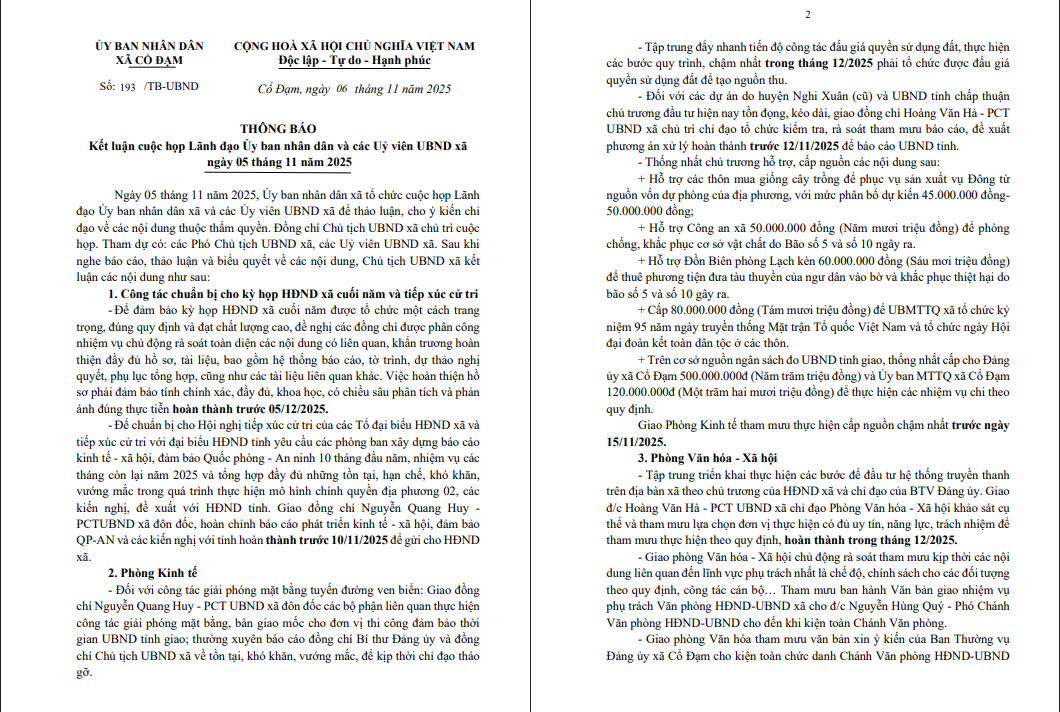 Ngày 05 tháng 11 năm 2025, Ủy ban nhân dân xã Cổ Đạm tổ chức cuộc họp lãnh đạo UBND xã và các Ủy viên UBND xã nhằm thảo luận, cho ý kiến chỉ đạo đối với các nội dung thuộc thẩm quyền của UBND xã.