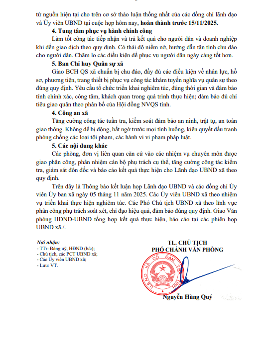 THÔNG BÁO Kết luận cuộc họp Lãnh đạo Ủy ban nhân dân và các Uỷ viên UBND xã ngày 05 tháng 11 năm 2025