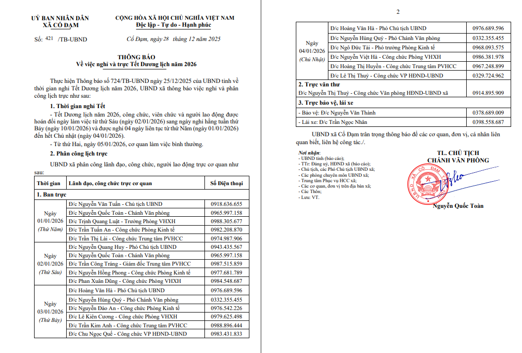 thời gian nghỉ Tết Dương lịch năm 2026, UBND xã thông báo việc nghỉ và phân
