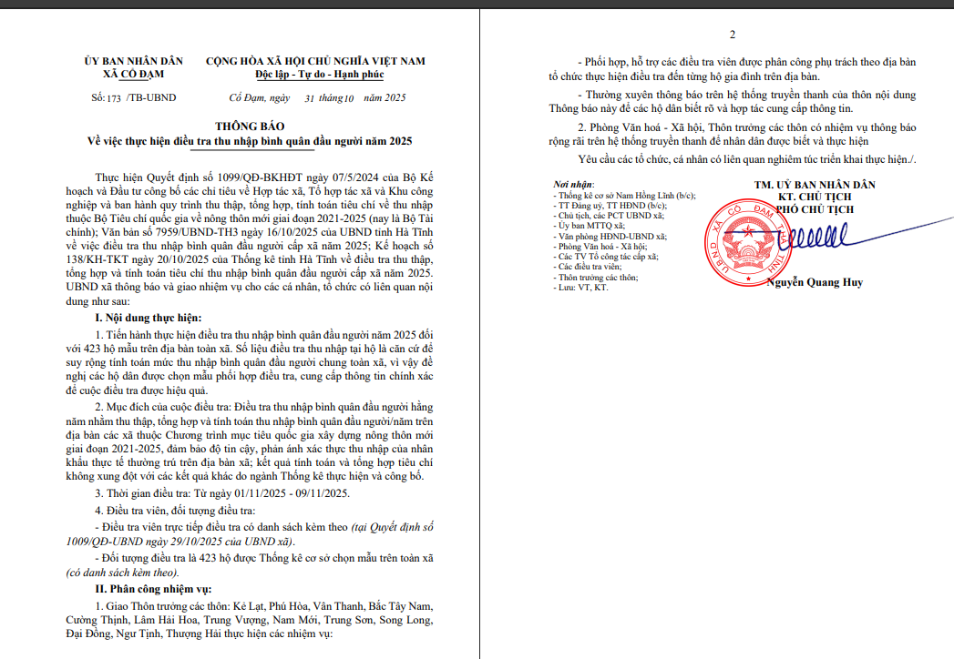 UBND xã Cổ Đạm thông báo và giao nhiệm vụ cho các cá nhân, tổ chức có liên quan thực hiện nghiêm túc việc điều tra thu nhập bình quân đầu người năm 2025 theo đúng quy trình, hướng dẫn của cơ quan Thống kê tỉnh.