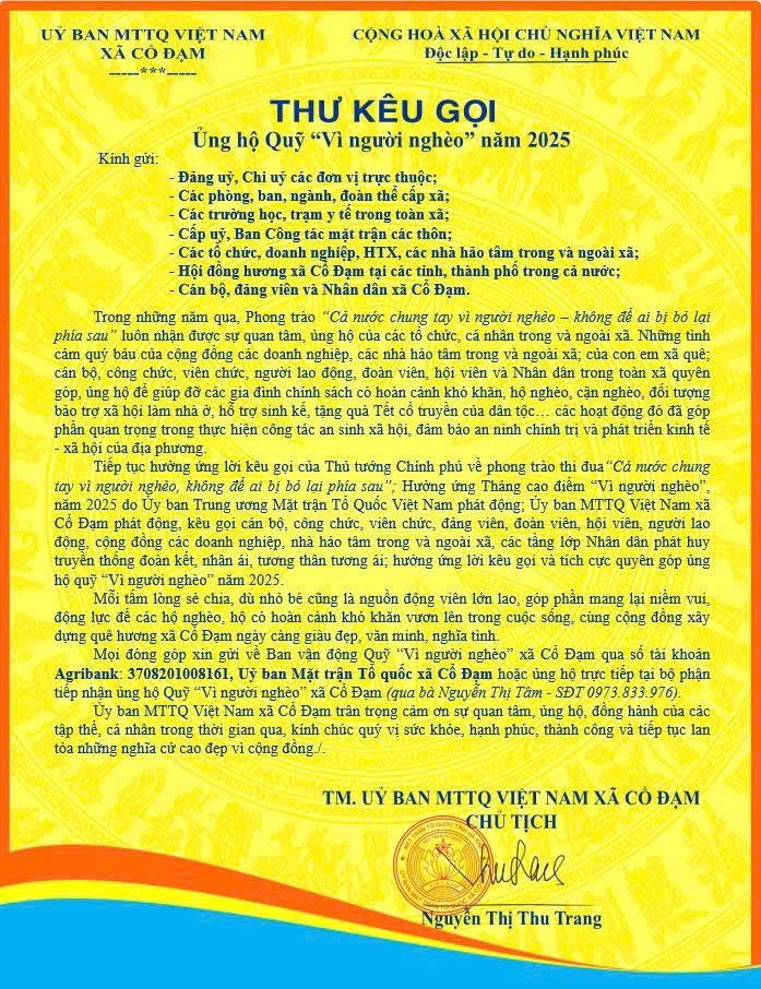 Ủy ban Mặt trận Tổ quốc Việt Nam xã Cổ Đạm trân trọng cảm ơn sự quan tâm, đồng hành, ủng hộ của các cơ quan, đơn vị, doanh nghiệp, tổ chức, cá nhân và toàn thể Nhân dân.