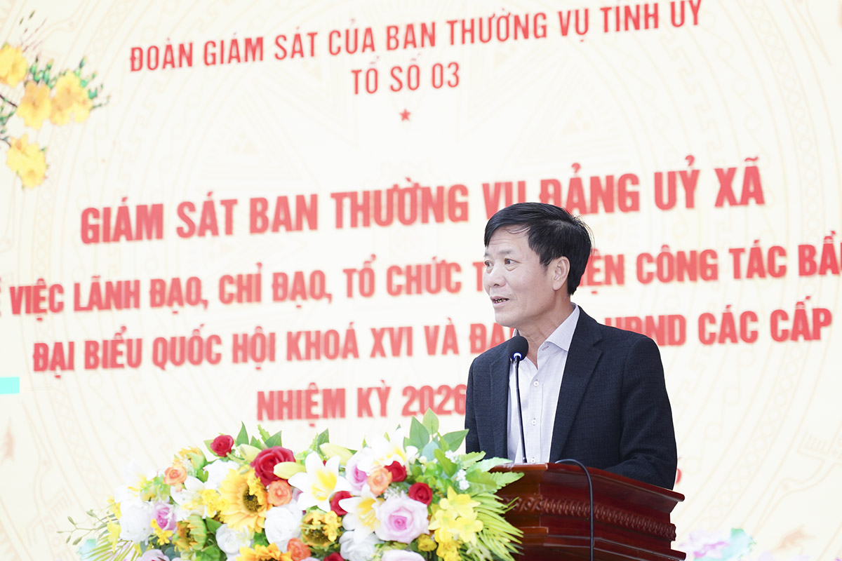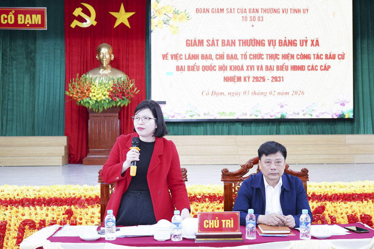 Phát biểu kết luận tại buổi giám sát, Phó Chủ nhiệm Ủy ban Kiểm tra Tỉnh ủy Nguyễn Thị Như Quỳnh ghi nhận và đánh giá cao tinh thần trách nhiệm, nghiêm túc, chủ động trong việc tập trung lãnh đạo, chỉ đạo và tổ chức thực hiện công tác chuẩn bị bầu cử ĐBQH khóa XVI và đại biểu HĐND các cấp, nhiệm kỳ 2026 - 2031 của xã Cổ Đạm.