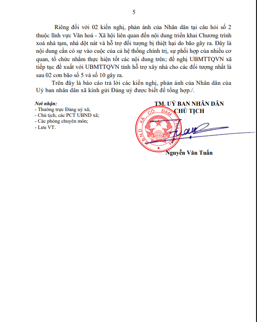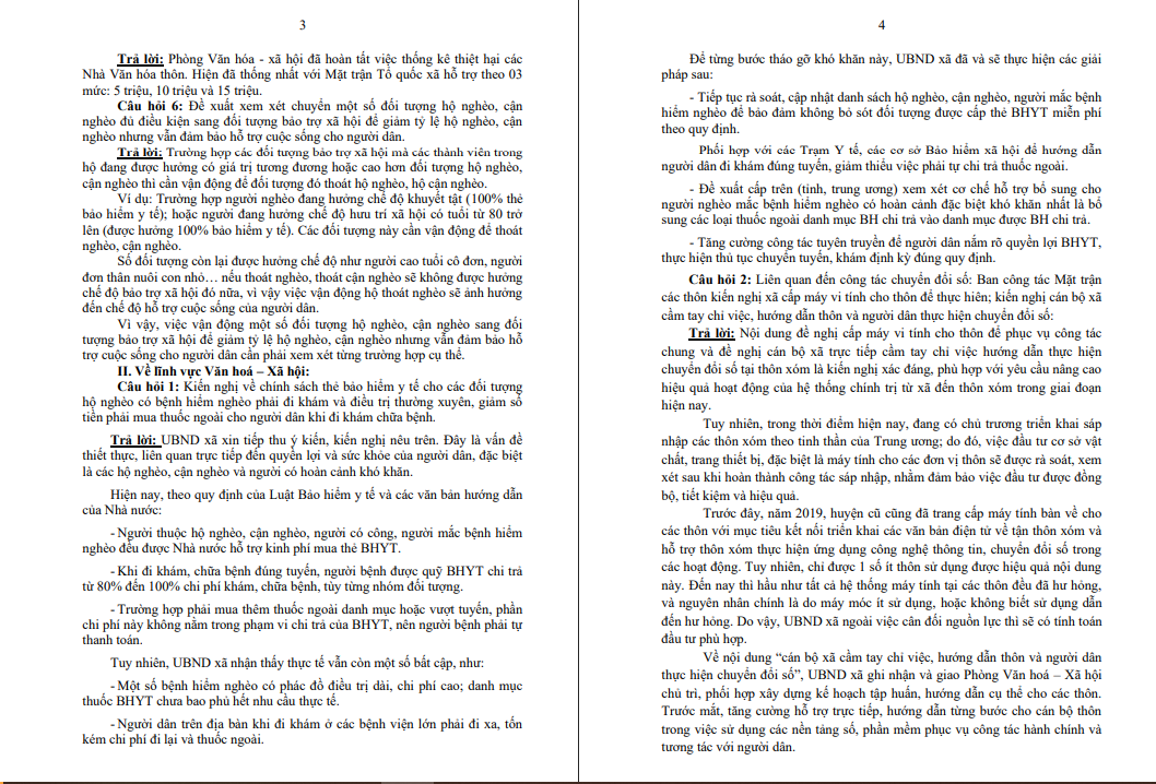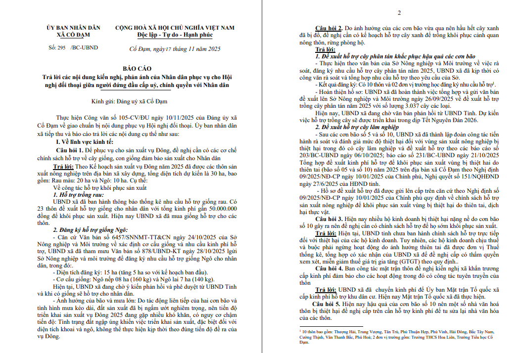 Qua báo cáo này, UBND xã đã giải trình rõ từng nội dung, nêu tiến độ thực hiện, các chính sách đang được triển khai, đồng thời báo cáo cấp trên những nội dung vượt thẩm quyền để sớm xem xét, hỗ trợ Nhân dân. UBND xã cam kết tiếp tục đồng hành, lắng nghe và kịp thời tháo gỡ những khó khăn, góp phần ổn định đời sống và sản xuất của bà con trên địa bàn.
