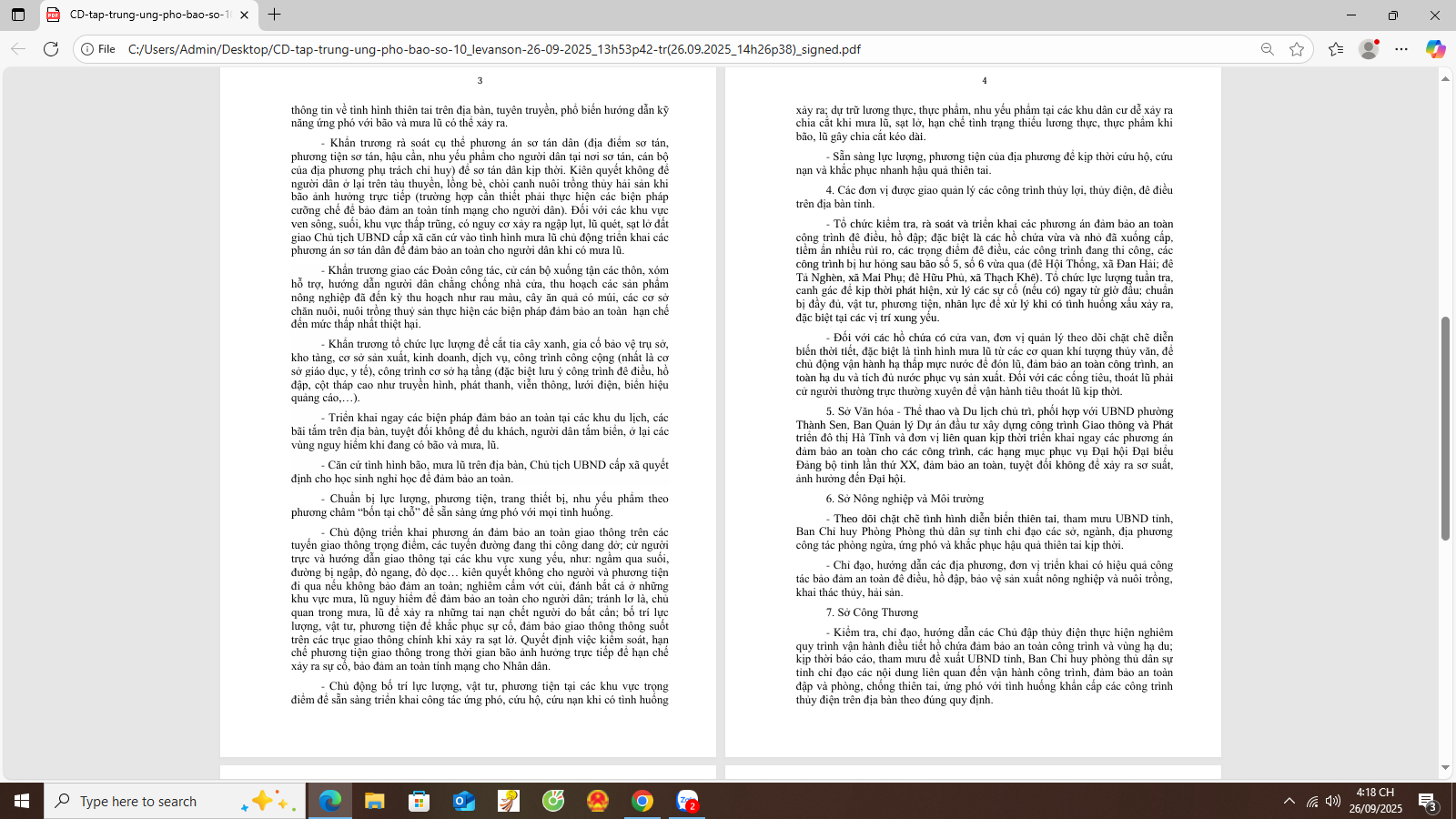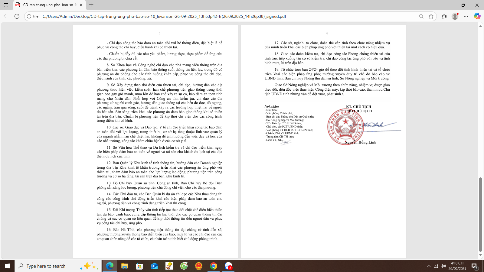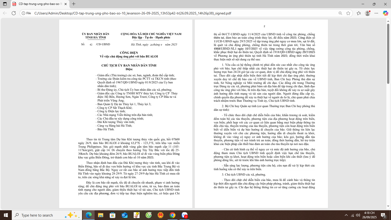 Trước diễn biến phức tạp của bão BUALOI, ngày 26/9/2025, Chủ tịch UBND tỉnh Hà Tĩnh đã ký ban hành Công điện số 42/CĐ-UBND gửi các sở, ban, ngành, địa phương và đơn vị liên quan.
