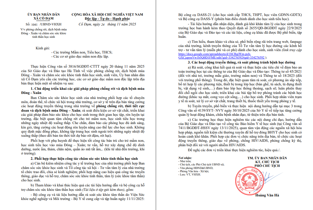 UBND xã đề nghị các đơn vị nghiêm túc triển khai thực hiện nhằm bảo đảm sức khỏe thể chất và tinh thần cho học sinh trên địa bàn trong mùa Đông – Xuân năm 2025–2026.