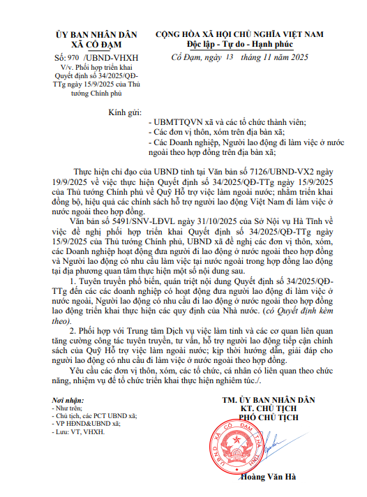 Quyết định số 34/2025/QĐ-TTg quy định về Quỹ Hỗ trợ việc làm ngoài nước nhằm giúp người lao động tiếp cận thông tin, được tư vấn, hỗ trợ về chi phí, thủ tục và các chính sách liên quan khi tham gia thị trường lao động nước ngoài. UBND xã đề nghị các thôn, xóm, doanh nghiệp hoạt động dịch vụ đưa người đi lao động ở nước ngoài phối hợp phổ biến nội dung Quyết định đến người dân, đặc biệt là người lao động đang có nhu cầu.