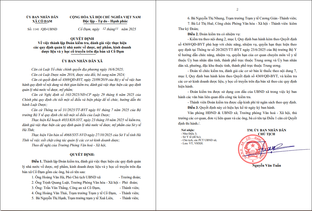 Theo Quyết định, ông Hoàng Văn Hà – Phó Chủ tịch UBND xã được giao làm Trưởng đoàn kiểm tra; ông Trịnh Quang Luật – Trưởng Phòng Văn hoá - Xã hội làm Phó đoàn cùng các thành viên là đại diện Công an xã, Trạm Y tế và cán bộ chuyên môn các đơn vị liên quan.